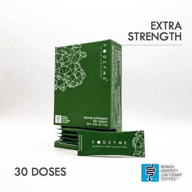 FODZYME®is a tasteless enzyme powder designed to break down FODMAPs (fructan, GOS, and lactose) in food to make meals more digestible. It's formulated specifically for people with FODMAP sensitivities.